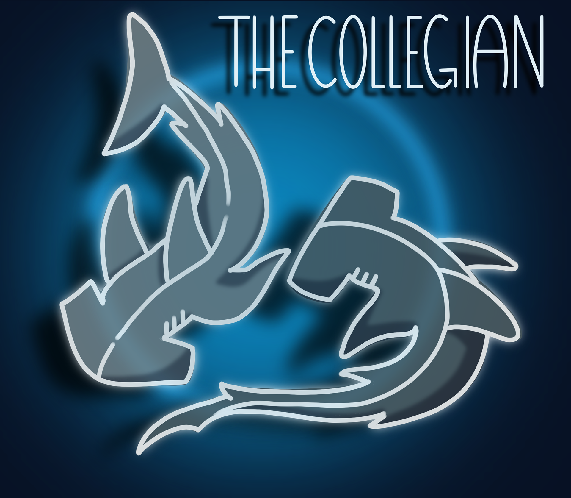 Originally, this was the cover image for Issue 5 of this year’s volume of The Collegian. My manager had asked me to create square versions of some of the previous Collegian covers and this was one of the covers they asked for. When I designed the original cover, I was given the theme of “Taking a Deep Dive.” I have a love for hammerhead sharks and took this as an opportunity to draw them. I started out with a simple sketch and flat layers of color. I then wanted to make the sharks look like they were circling each other on the ocean floor. I made it look like there was a spot of sunlight on them as if there were in some sort of underwater cove. I added white line art to make it also appear as highlight from the sun. I added a blue ring to add to the glowing affect. To add the text, I transferred the colored version and the sketched version into Adobe Illustrator so that I could create the text. I outlined the sketched title and then selected the shapes and shifted them over to the finished side. Afterwards, when I was asked for a square version, I removed the text and squared out the colored illustration. I then set up an assisted drawing guide to help keep my lines straight while I wrote out “The Collegian.” After I was finished with the sticker, I sent it over to my manager.